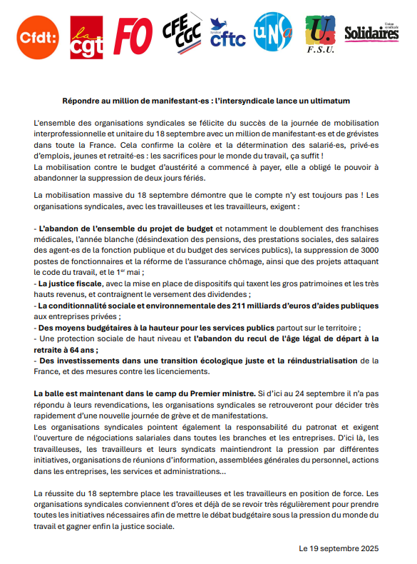 Intersyndicale – suite à la mobilisation du 18 septembre